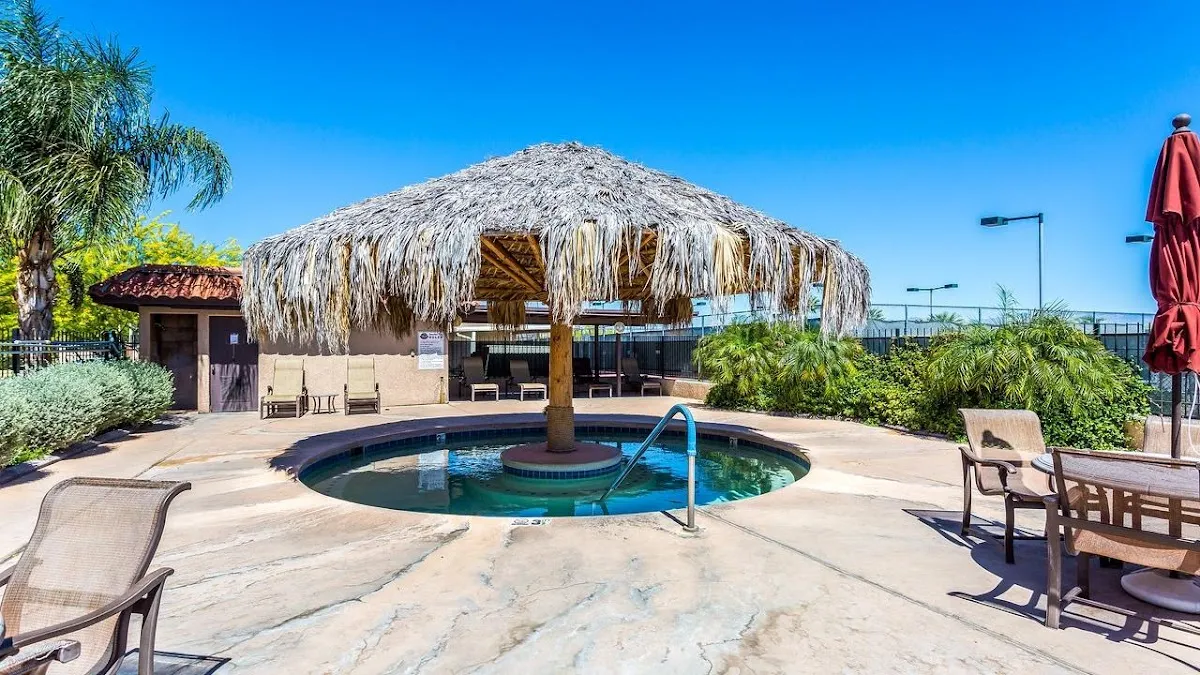 Voyager RV Resort at 8701 S Kolb Rd in Tucson, AZ is an active adult RV community with 14-16 dedicated outdoor concrete pickleball courts featuring permanent lines and nets. The Pickleball Club is one of the resort's most active groups. Amenities include food, restrooms, water, and wheelchair accessibility.